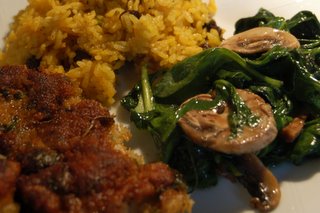 Fried chicken thigh with kosher salt, paprika, cumin, corn starch, egg white, panko bread crumbs, bit of lemon, fried in olive oil. Turmeric rice (raisins, garlic powder, salt, pepper, turmeric, beef stock). Wilted spinach and mushrooms.